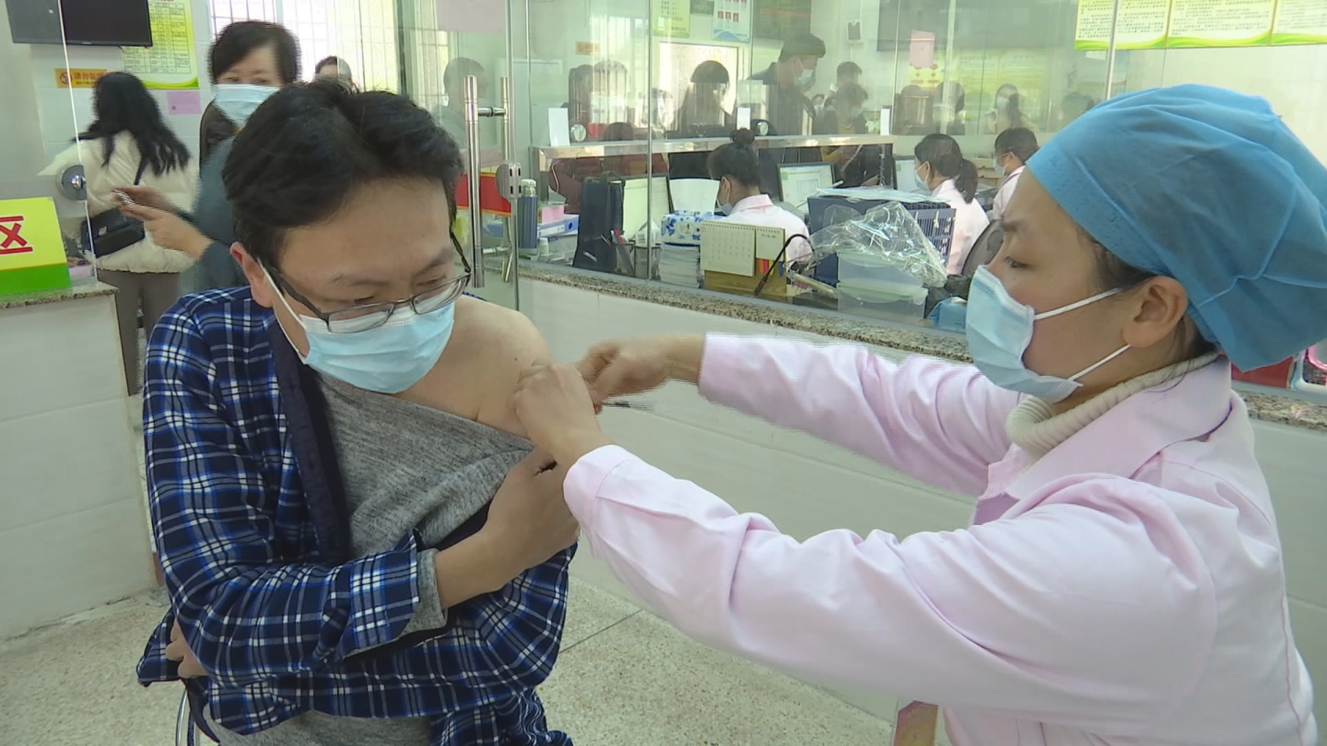 一线人员在接种室内接种疫苗
