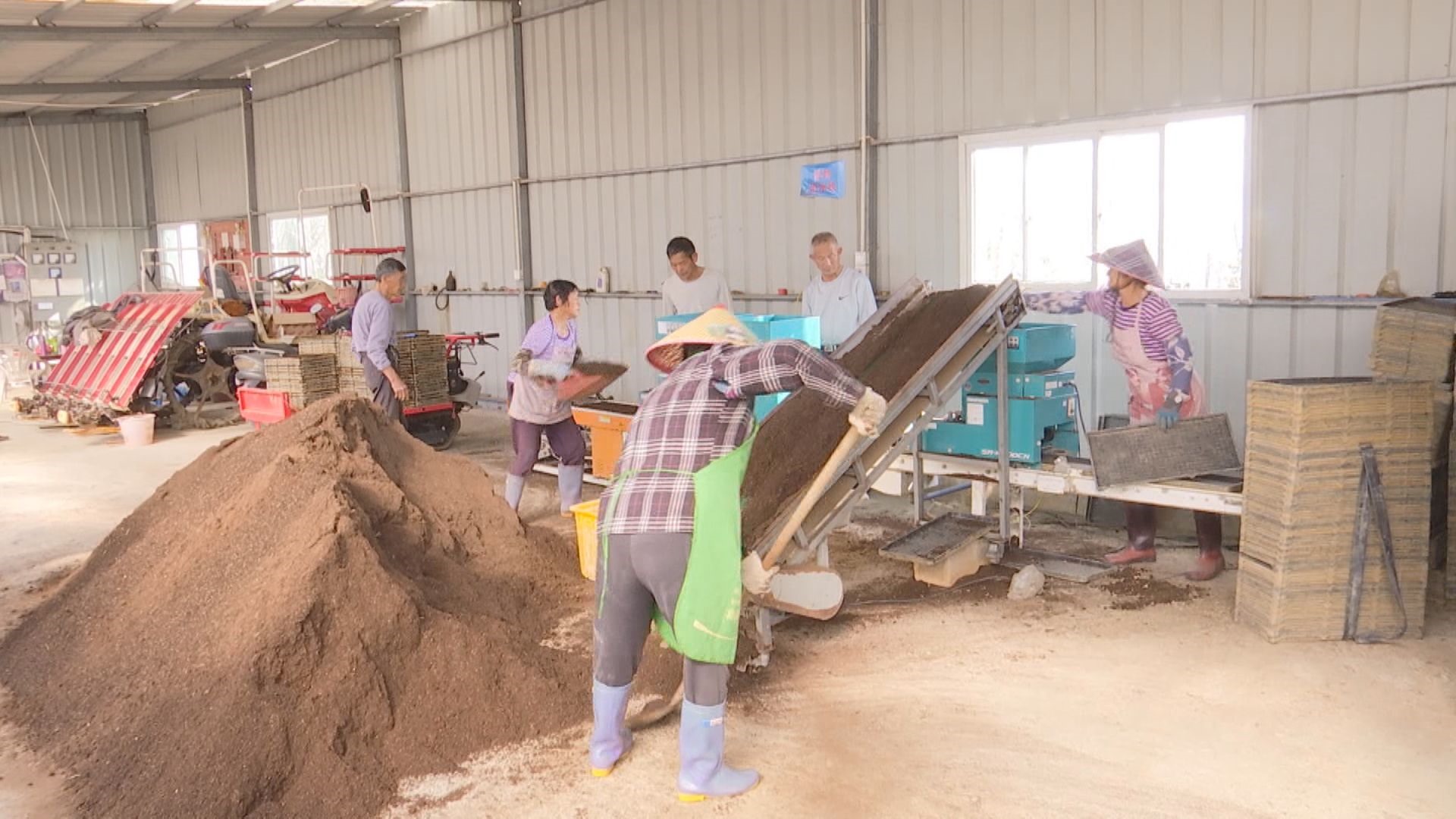 2月23日,记者在江边家庭农场看到,育秧流水线呈现出一派繁忙的生产景象,工人们分工合作,将水稻专用育秧基质和田间的泥土以及种子混合装盘,再用推车运载到育秧棚,播种育秧井然有序。