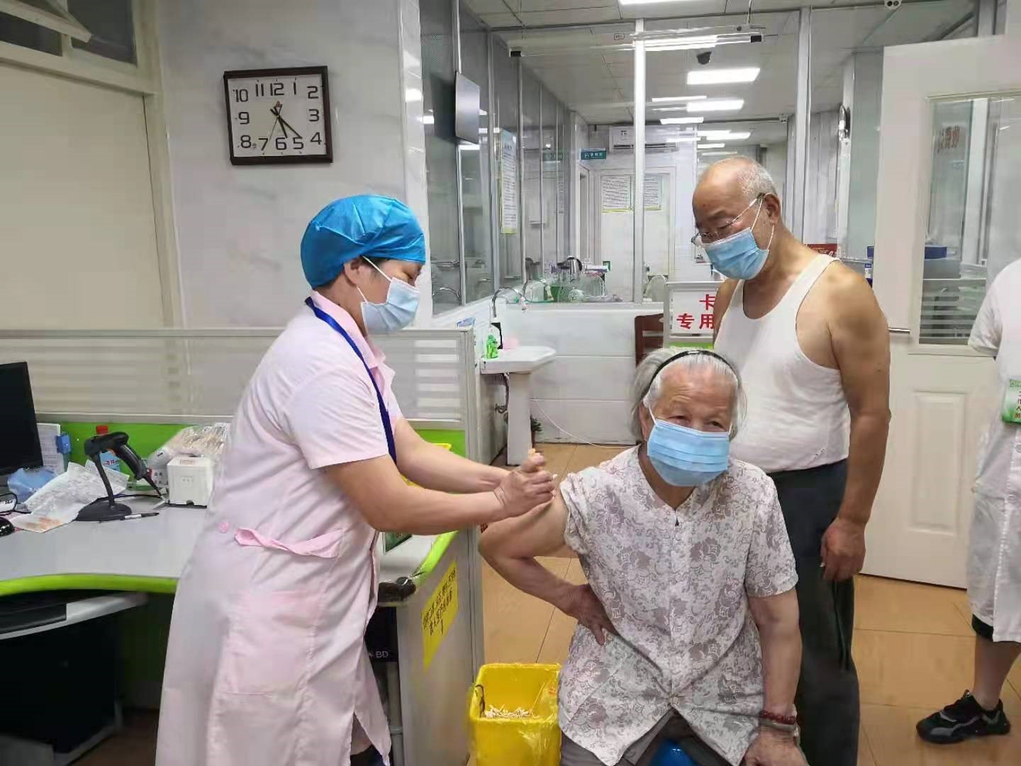 翁奶奶在七旬儿子的陪同下接种了第一针新冠疫苗