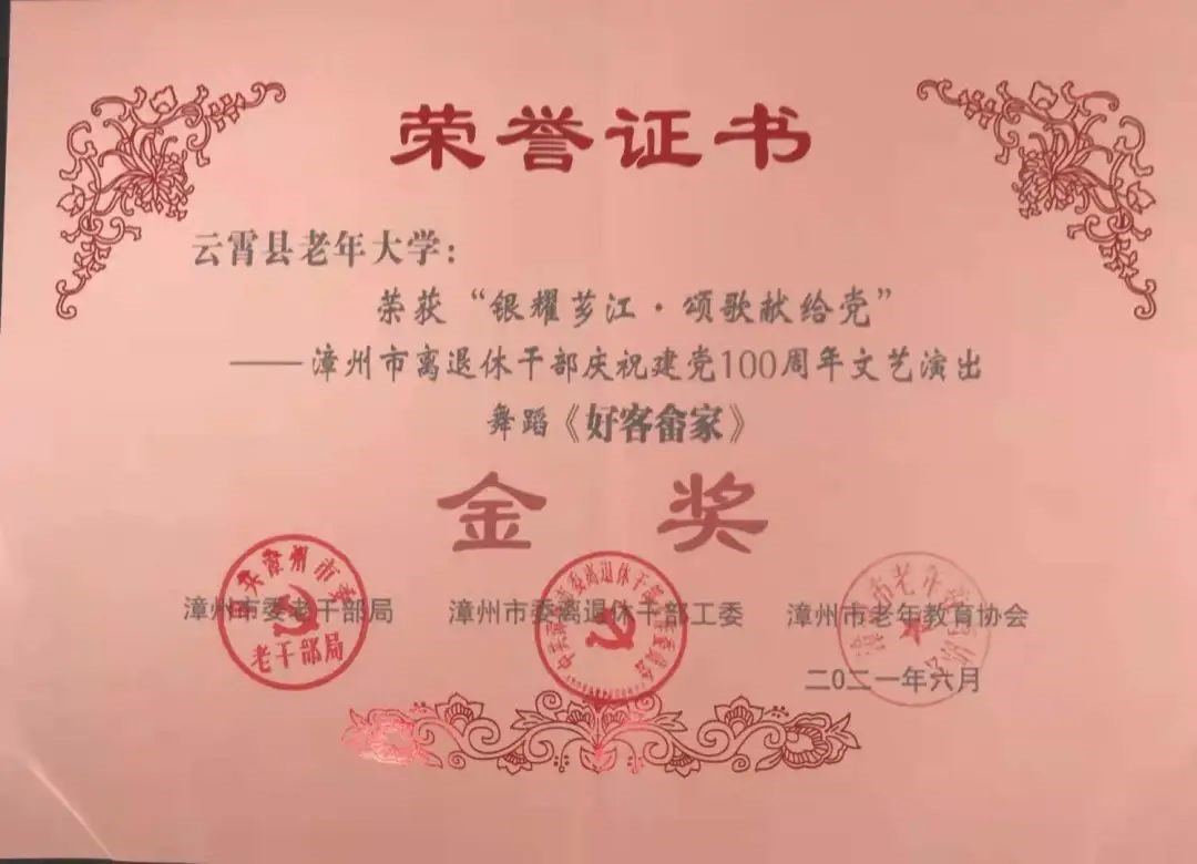本报讯(林建全 唐丽真)6月19日,县老年大学舞蹈队参加“银耀芗江·颂歌献给党”为主题的漳州市离退休干部庆祝建党100周年文艺演出,以民族舞蹈《好客畲家》演出荣获舞蹈类节目金奖。该舞蹈由县老年大学原创,生动展现新时代畲家山村坡兜畲族村在脱贫攻坚和乡村振兴中的喜人巨变,精彩演绎了畲族群众淳朴坚韧、勤劳好客的畲族风情,也展现了我县离退休党员干部的良好精神风貌,传播了“云霄好声音”,为加快新云霄建设提供精神动力。
