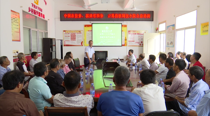 7月19日上午,福建农林大学新农村发展研究院副院长、云霄杨桃科技小院首席专家朱朝枝教授带领专家团队和福建农林大学大学生暑期三下乡“下河杨桃助产促农”社会实践队来到下河乡下河村,开展为期七天的科学研究和技术服务活动。在公益培训会上,专家们分别为当地种植大户作了题为《杨桃栽培技术》《智慧农业》《农产品营销》《加快农村一二三产业融合 推进乡村产业振兴》的授课讲解。从如何栽种杨桃、种好杨桃、卖好杨桃,推动产业融合等方面,详细地给果农们支招。