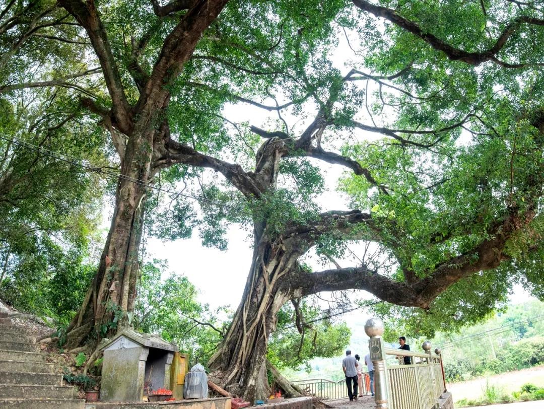 宅兜庙遗址右侧旁,参天的古树,郁郁葱葱。有两棵树龄达232年历史的榕树,最引人注目。它不仅高大、挺拔,枝繁叶茂。且树冠大,树形好;树高20余米,胸径2米,相距两米多。原为独立的两棵树,后来越长越奇妙;只见右边一棵榕树将自己的嫩枝条,搭在了左边另一棵榕树的肩上,丝毫没有发现人为地将它们拉扯在一起的痕迹,令人啧啧称奇。