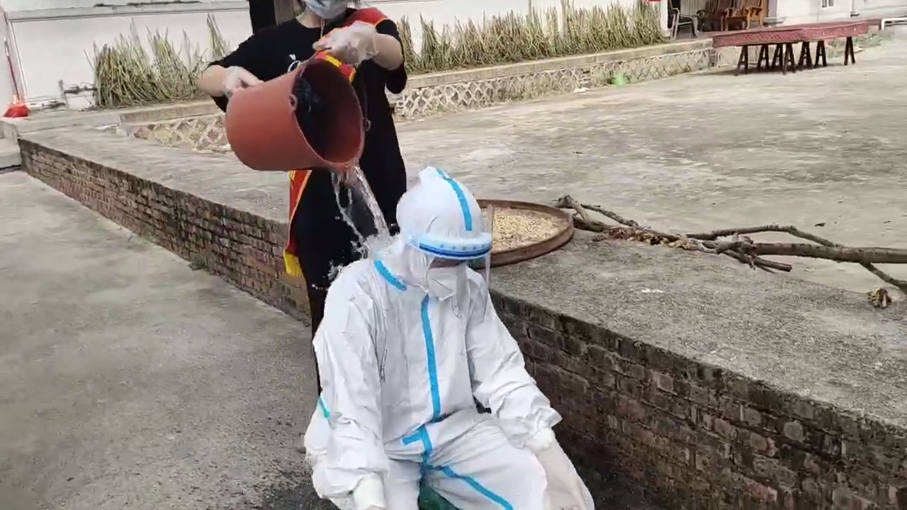 当地骄阳似火,闷热难当。身披全身防护服的汤丽芬和她的同事很快全身湿透,渐渐体力不支。14日下午2点40分左右,汤丽芬跟同事已经工作了3个多小时,累得走不动。志愿者见汤丽芬难受,提出给她浇冷水降温。一桶冷水淋身,汤丽芬感觉“透心凉”,一下子缓解了过来。