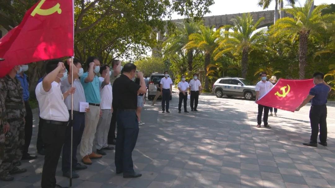 在金汤湾集中医学观察点,疫情防控临时党支部党员对党旗宣誓