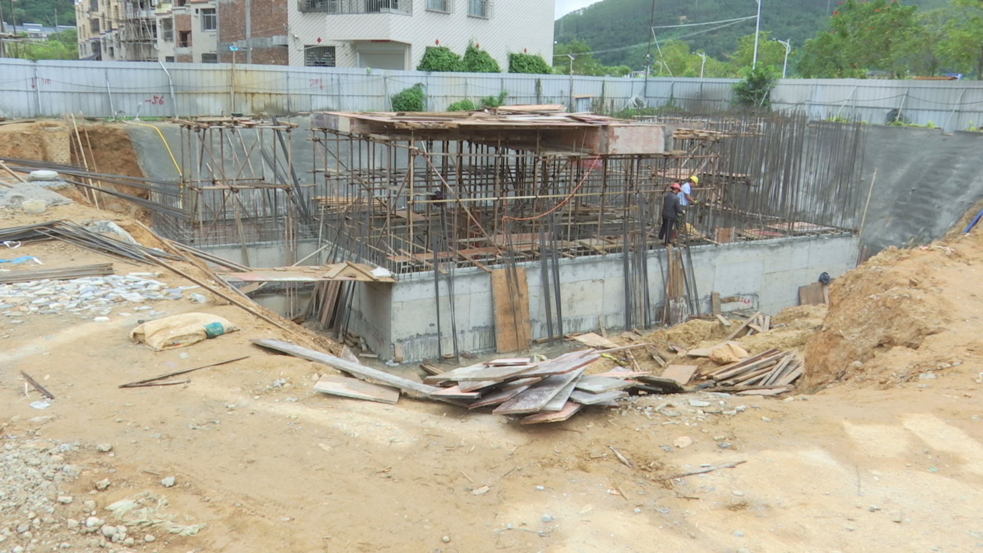 在火田镇政和社区农村生活污水处理工程现场,工人们正在对污水处理站调节池池壁做钢筋绑扎施工,后期将对该站的调节池做模板制作安装、浇筑混凝土。该污水处理站日处理量1100吨,受益人口1.3万人,目前管网的施工已经完成,主管网完成量已经达到6.7公里,支管完成2.2公里,整体工程预计12月中旬可以完工。