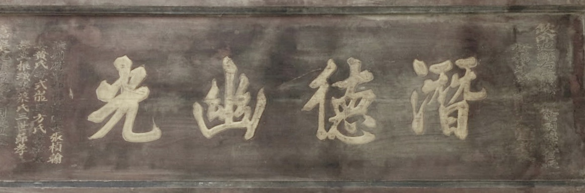 “潜德幽光”节孝匾原挂于菜埔城北门内四合院主厅堂上,杉木所制,长179、高59厘米,内容为“潜德幽光”,上款“钦命吏部右侍郎、实录馆副总裁官、提督福建学政,纪录七次,恩普为”,下款“漳州府平和县故儒士张桢翰妻黄氏、子式龙妻方氏、孙故太学生振玑妻蔡氏三世节孝。嘉庆九年(1804年)孟冬之月穀旦立”。此匾为清嘉庆九年,吏部右侍郎、提督福建学政恩普为菜埔村漳州府平和县故儒士张桢翰妻黄氏、子张式龙妻方氏、孙故太学生张振玑妻蔡氏“三世节孝”所立。