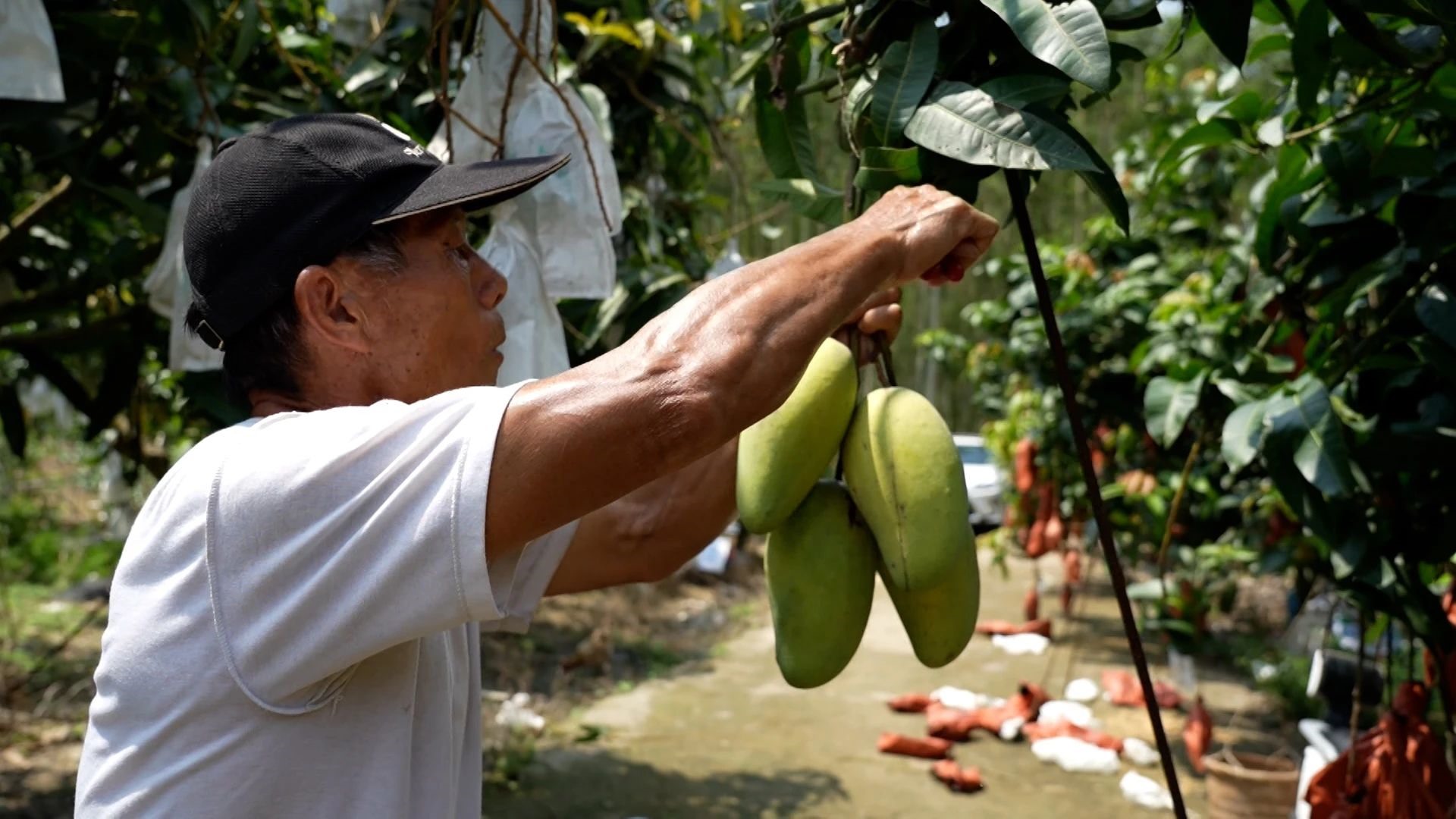古楼村这里光照充足、雨水丰沛、土壤肥沃,得天独厚的自然条件为芒果树提供了绝佳的生长环境。与芒果打“交道”二十六年的林森溪,谈起芒果种植经验,他满是欢喜,娓娓道来:“我有差不多二十六年的种植经验,都是无公害种植。在芒果长到两、三公分时就开始套袋,等芒果成熟了再从树上摘下来,虽然此时芒果外表不太好看,但已十分成熟,吃起来口感很好。‘金煌’品种有非常好的口感,‘贵妃’甜度适中但汁水更多。今年收成预计在七万斤左右,收入大概能有二十万元。”