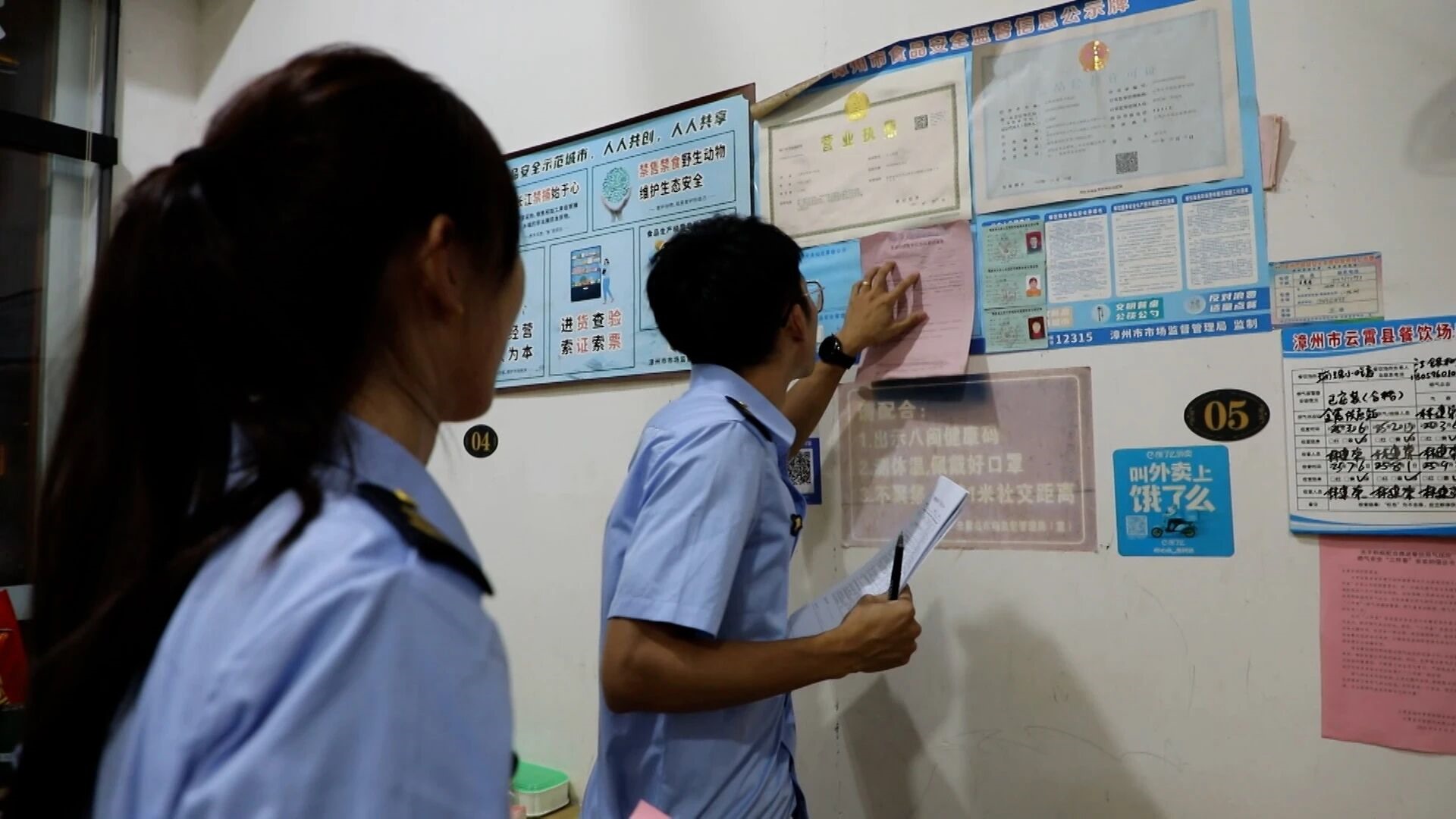 执法人员对照检查标准核查食品经营主体的经营资质