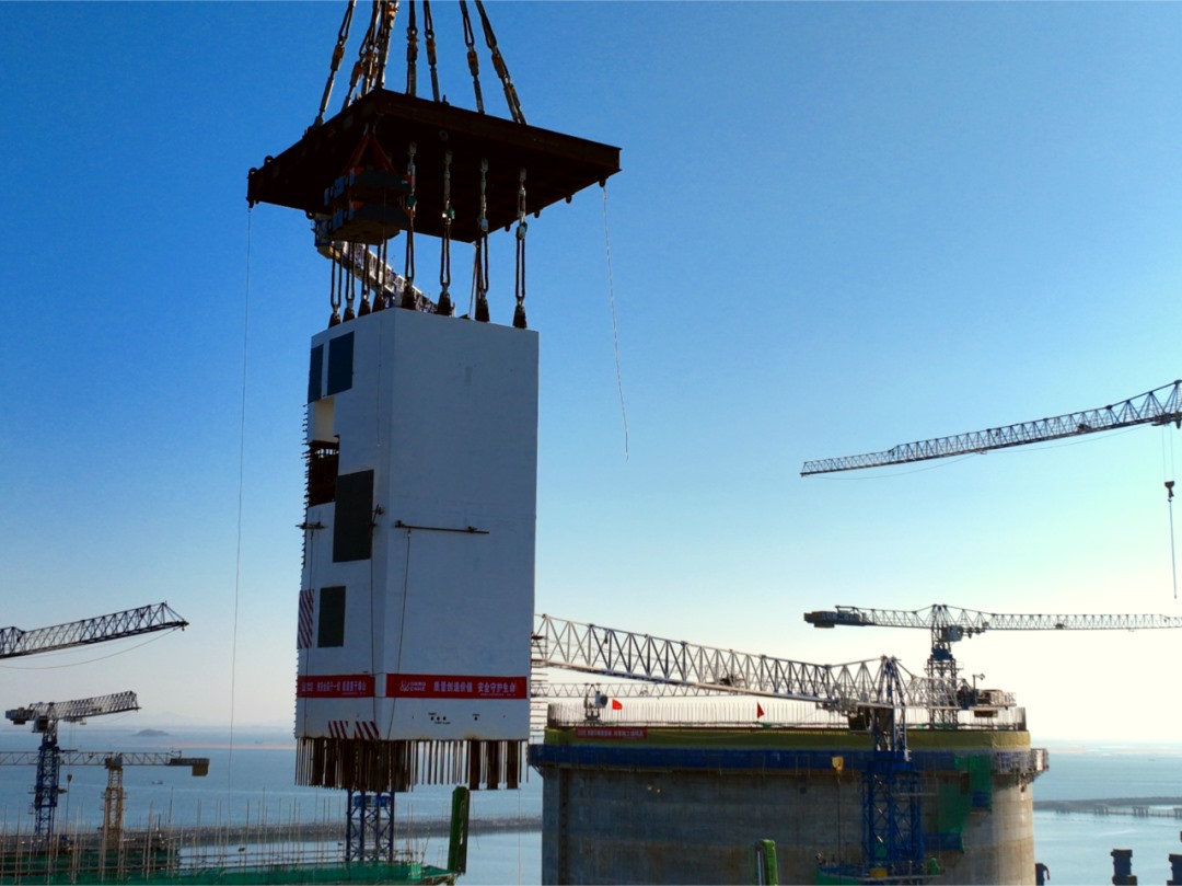 该模块构件是3号机组核岛核心区域的“核心骨架”之一,异形结构,高12米,“圆弧L形”底边长约10米,吊装总重超400吨。通过采用“场外预制+整体模块化吊装”的工艺,在厂房外预制场完成钢筋、埋件、混凝土及墙面装修等施工后,使用3200T吊车整体吊装就位。该工艺解决了模块吊具平衡设计、吊索具选型与模块精准对位等控制难点,实现了施工技术成套应用。