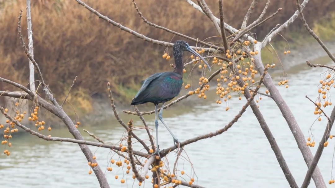 彩鹮是朱鹮的近亲,羽衣华美,通体闪烁着栗紫色与暗绿色的金属光泽,在阳光下能反射出绿色、蓝色、红色、褐色、黄色等各种颜色,宛如仙境中的七彩宝石。它曾因栖息地萎缩而踪迹难觅,一度被疑在国内绝迹。近年来,随着生态环境的改善,这一体型中等的涉禽,在中国各地被越来越多地记录到。如今,它的出现,成为了漳江口生态环境向好的生动注脚。