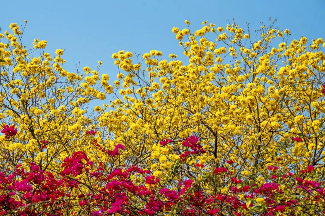 这个季节,小城的金黄是两种模样,油菜花是铺开的,是流淌的,是温温吞吞地占据一整片土地。而黄花风铃木是爆发式的,是猝不及防地闯进你眼里,这两种花,一个在地上,一个在天上。相映成趣,装点着这样好的春天!(来源:云霄文旅)